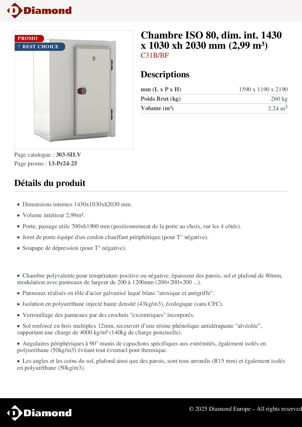 - Chambre polyvalente pour température positive ou négative, épaisseur des parois, sol et plafond de 80mm, modulation avec panneaux de largeur de 200 à 1200mm (200+200+200 …).