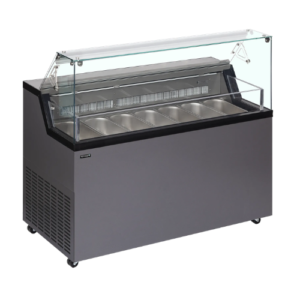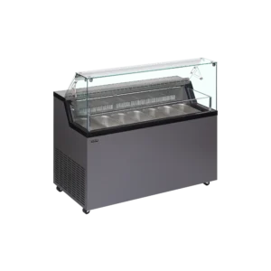 Découvrez la vitrine comptoir à crème glacée Mirabella, spécialement conçue pour attirer les clients et mettre en valeur vos glaces grâce à un design haut de gamme et une visibilité optimale. Idéale pour les glaciers, snack-bars, restaurants et points de vente, cette vitrine allie esthétique, praticité et performance.