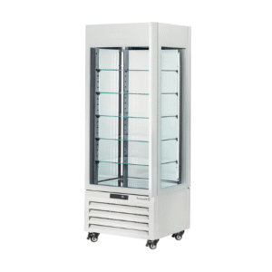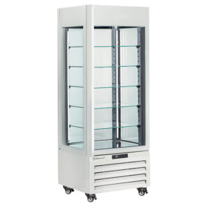- 5 étagères réglables en verre trempé (530×463 mm) sur crémaillères en acier inox AISI 304.